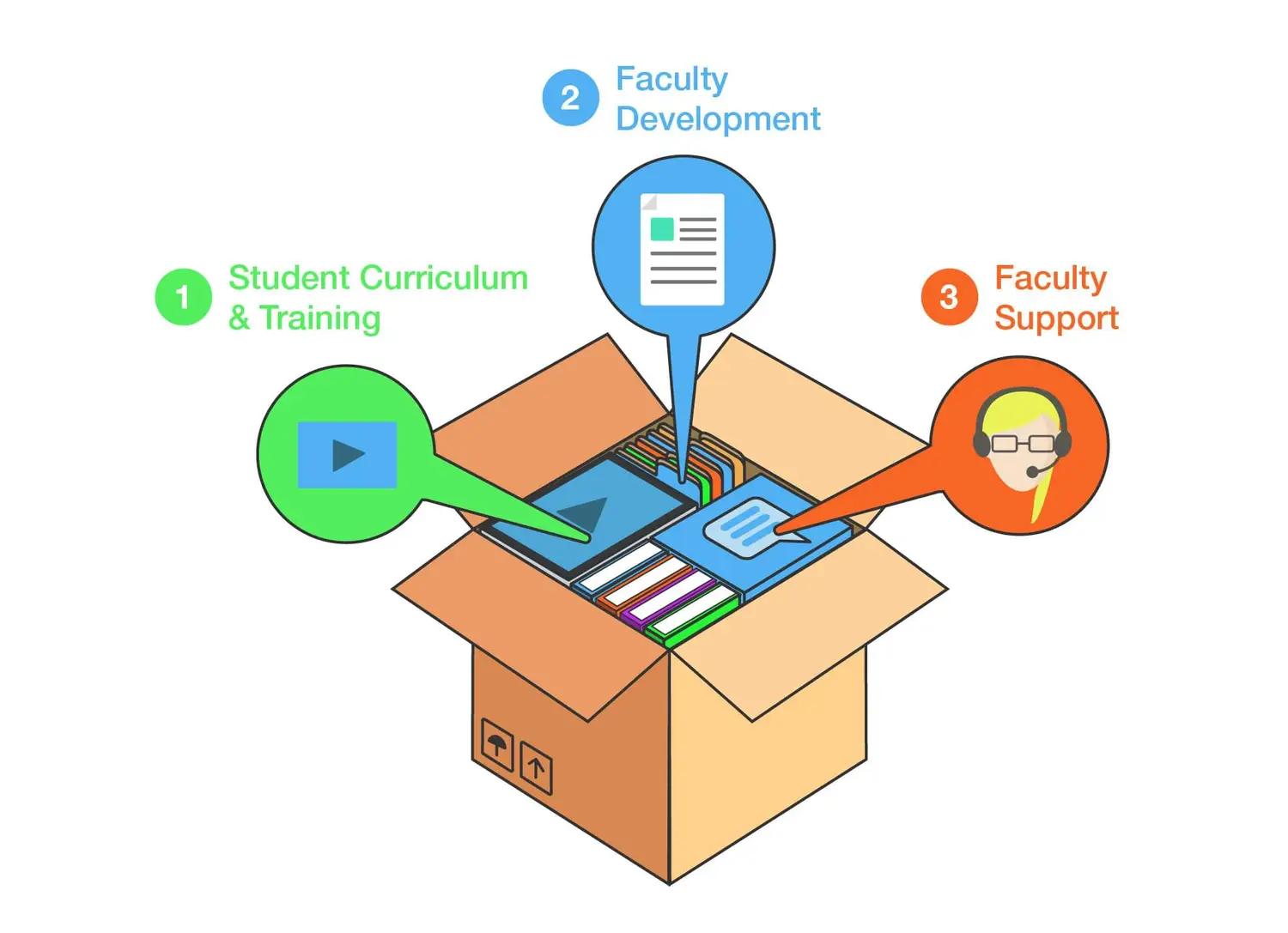 Our solution provides a turnkey solution for teachers that provide curriculum for students, professional development for faculty, and support for instructors. We provide the only curriculum solution that teaches the students in and out of the classroom AND supports teachers with our faculty development and live office hours, directly with the creators.